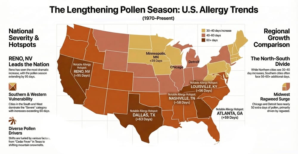 According to research from Climate Central, pollen seasons across North America are now about 20 days longer on average than they were in 1970. In some cities, the increase is far greater.