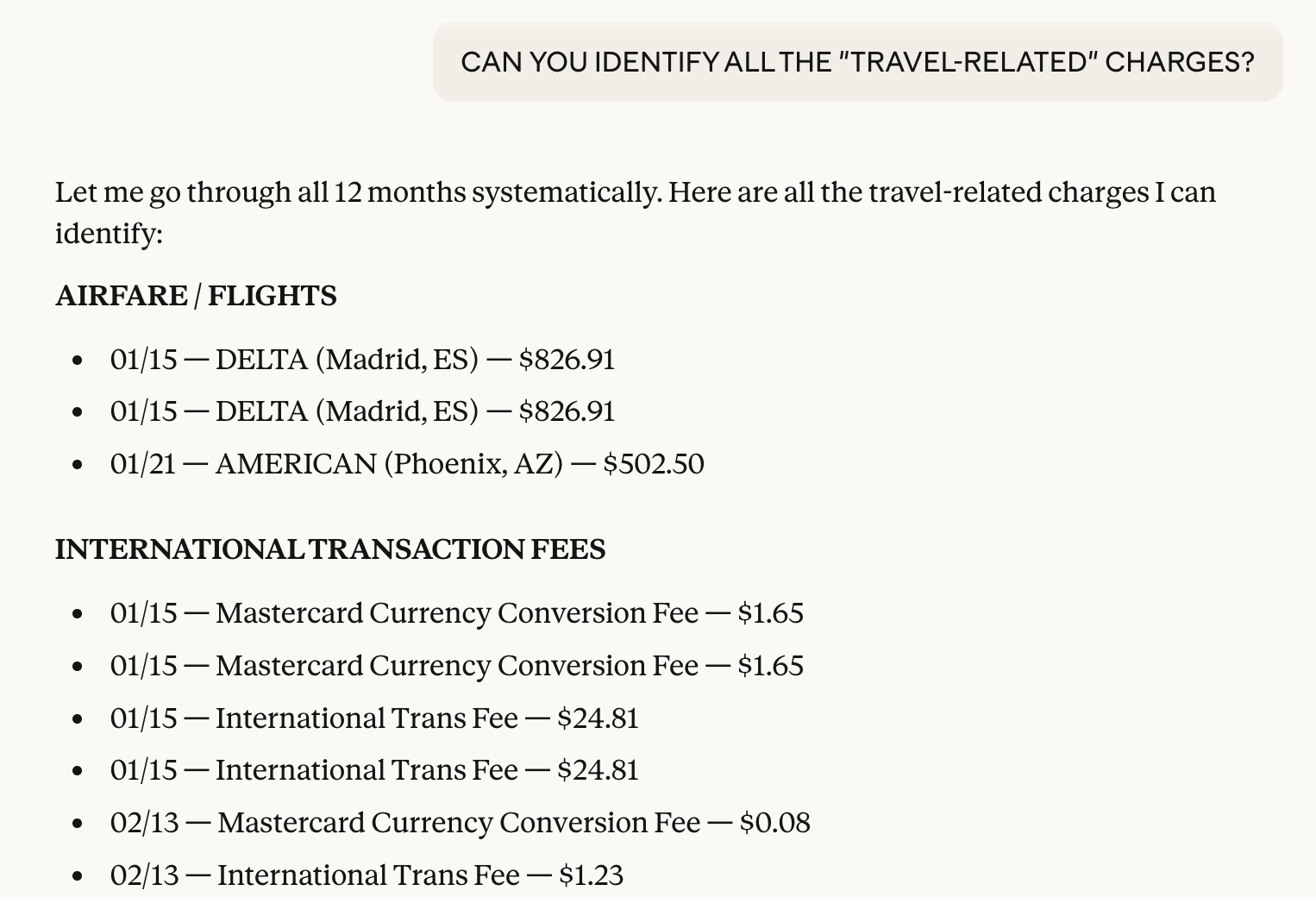 Then, I asked it to go through everything and let me know what items it thought I might be able to use for business expenses, donations, homeowner fees, insurance, medical, etc. Again, in under a minute, I had a complete breakout.