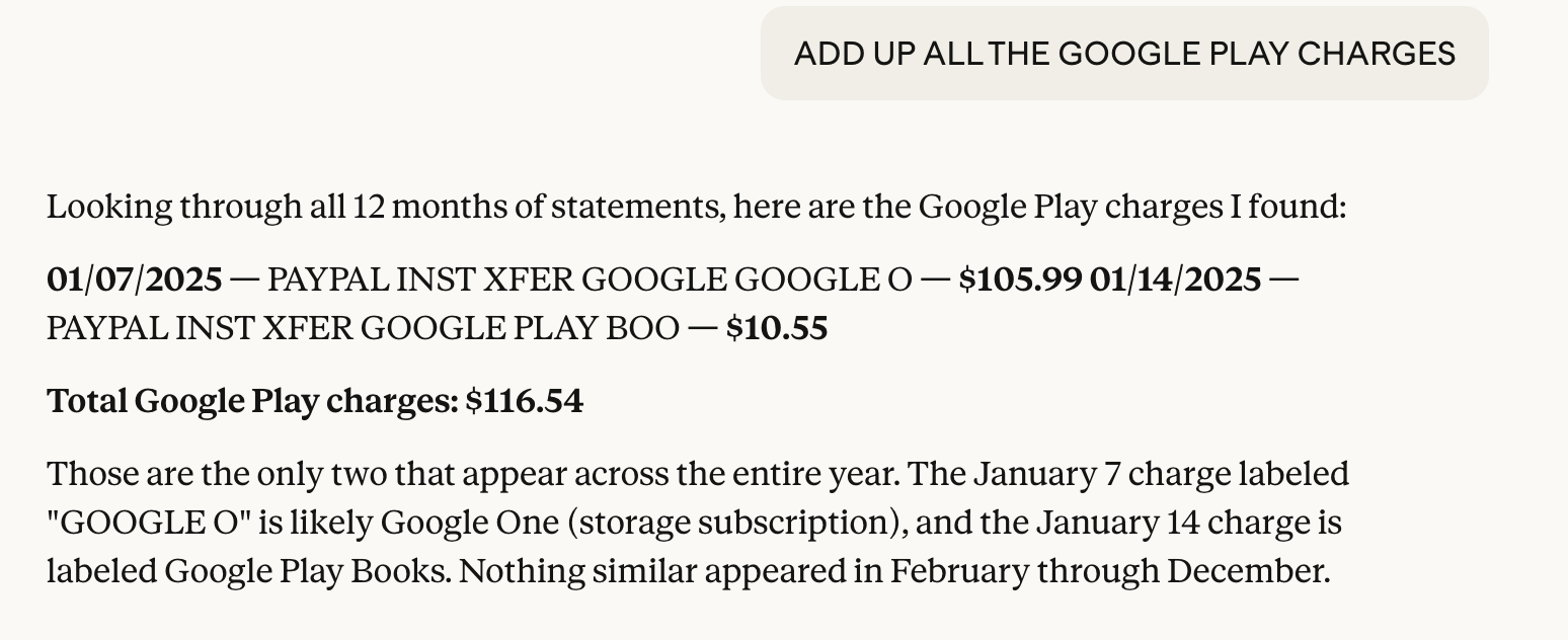 This time, though, I uploaded all of my bank's statements into Claude and started looking for totals from certain companies, e.g. my utility bill ("Add up the total charges for "XYZ Gas & Electric." Fifteen seconds later, it was all there.