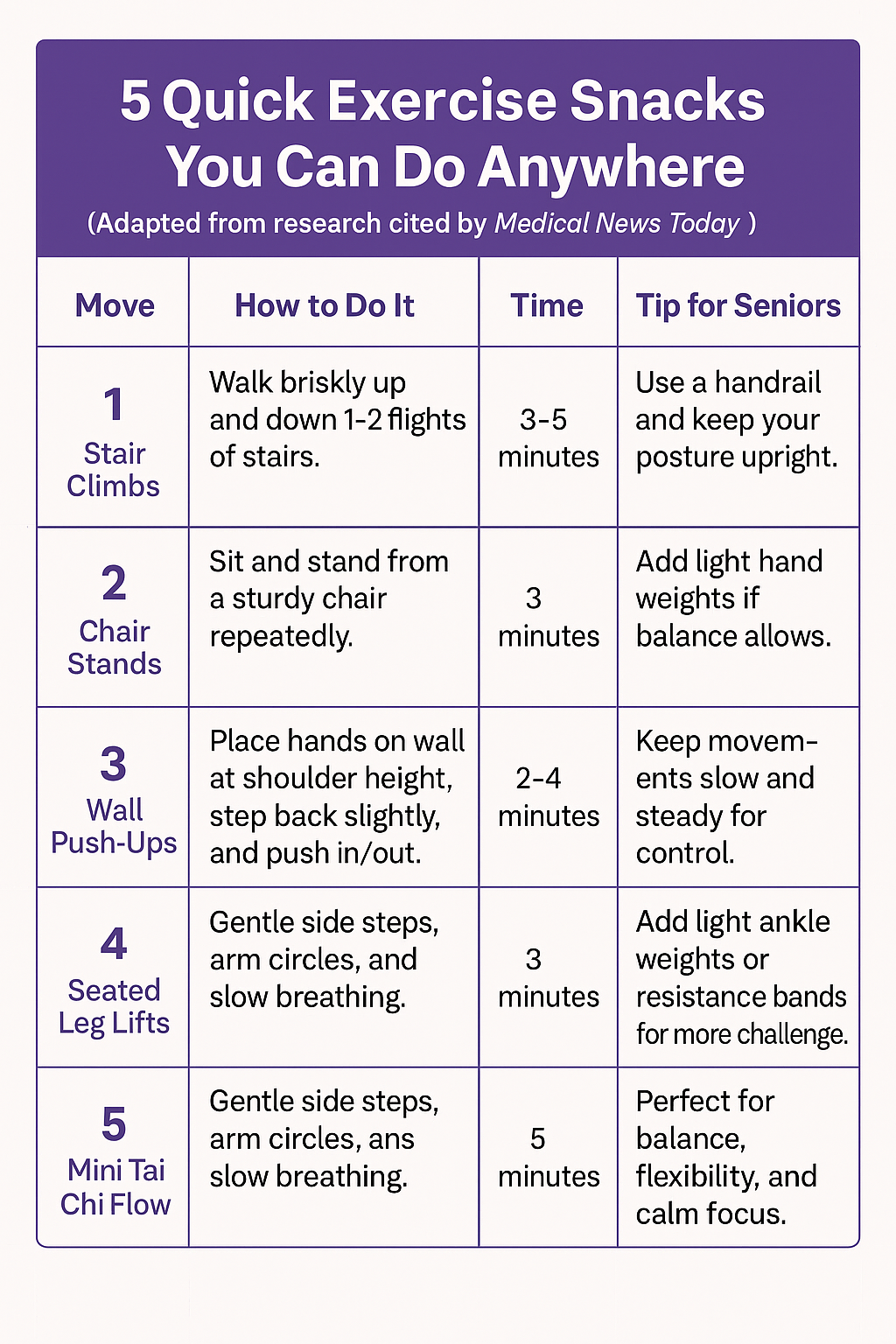 “When people are asked why they don’t exercise, the most common answers are lack of time and lack of motivation. Exercise snacks directly address both: They’re short, flexible, and easy to fit into daily routines.”