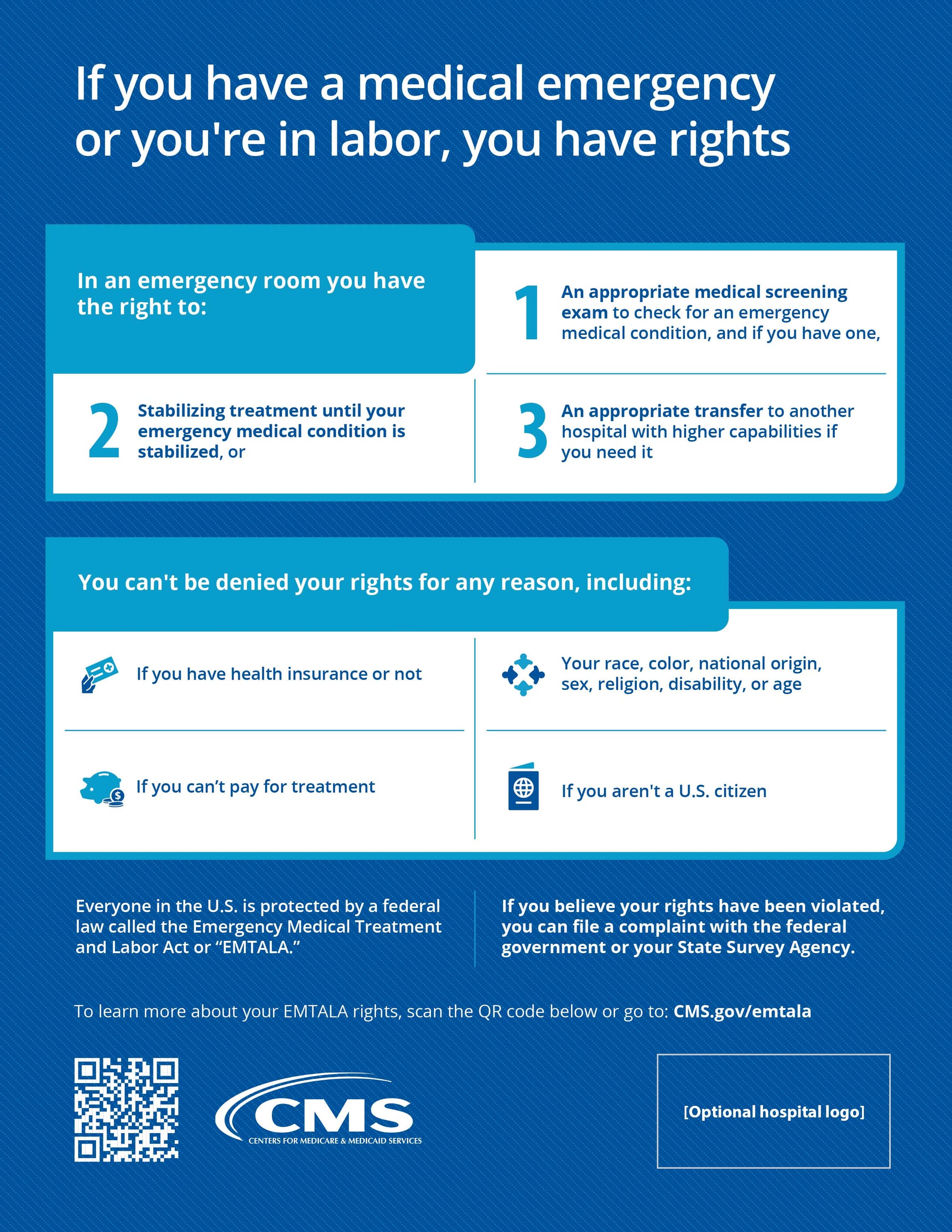 - A federal law called EMTALA requires hospitals to treat and stabilize anyone with an emergency, regardless of insurance or ability to pay.