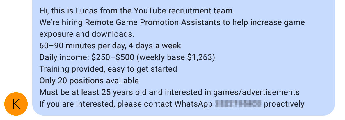 A short message pops up claiming to be from “the YouTube recruitment team.” The work is remote. The hours are light. The pay is eye-catching — hundreds of dollars a day for barely more than an hour’s effort.