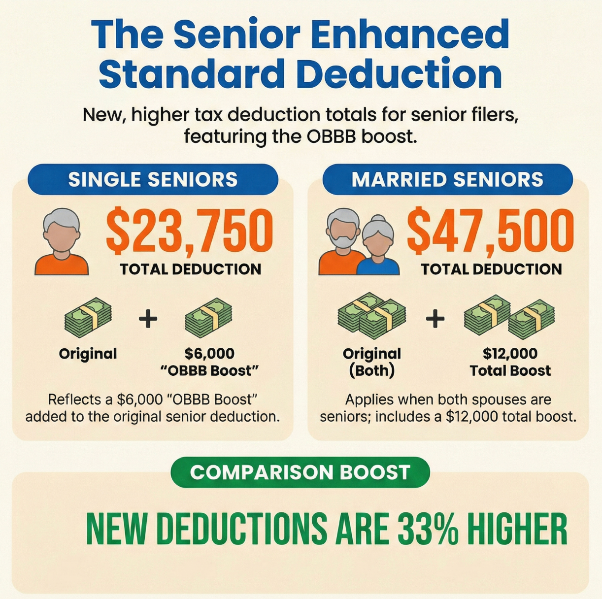 The senior deduction is in addition to the standard deduction and the existing extra standard deduction for people 65+. That means taxpayers who qualify can reduce their taxable income even more than before — potentially lowering their total tax bill or increasing their refund.
