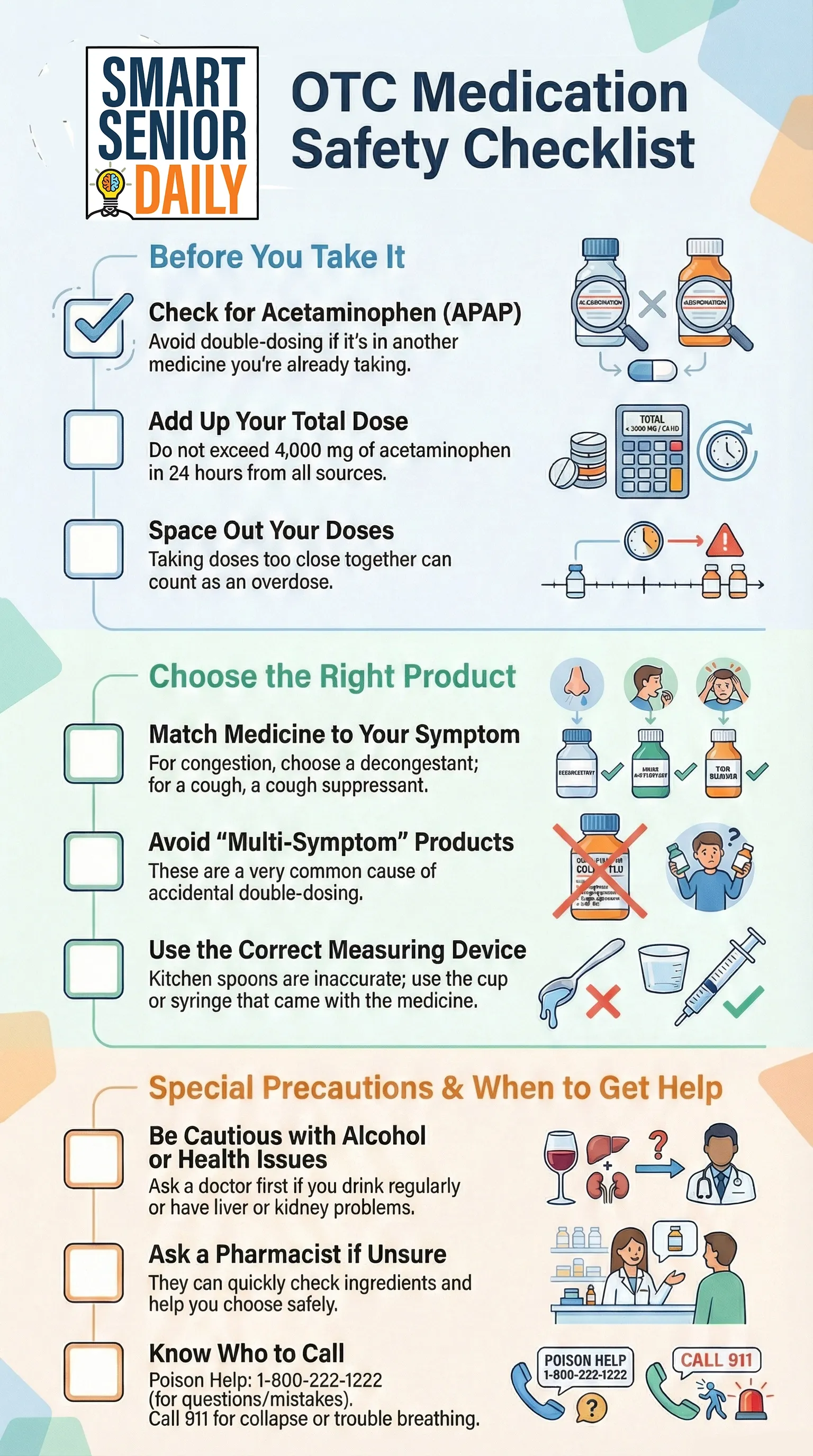 Treat one symptom at a time, using the fewest ingredients possible. Multi-symptom products are convenient—but they’re the most common cause of accidental acetaminophen overdose.