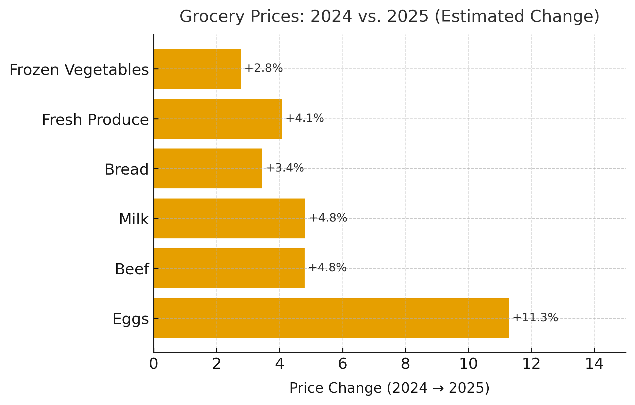 The biggest jumps have been in eggs, beef, and baked goods, while fresh vegetables and pantry staples have seen smaller increases or even brief dips. It’s not runaway inflation, but steady enough to pinch anyone on a fixed income.